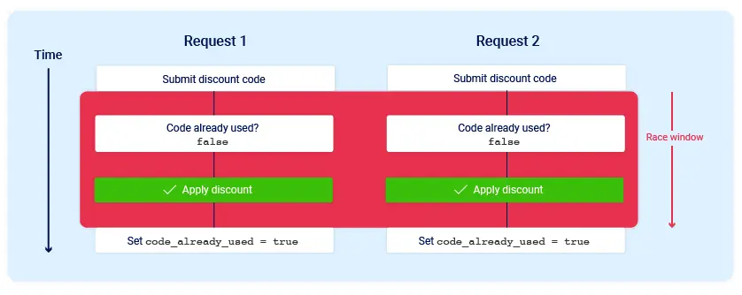 The problem? If two requests arrive at almost exactly the same time, both can pass the initial check simultaneously while the flag is still false. Both see the “race window” where the code hasn’t been marked as used yet, so both apply the discount before either has a chance to update the database. This is a TOCTOU flaw — Time of Check to Time of Use.