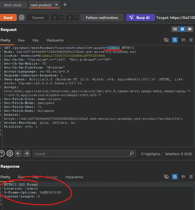 If you check the path parameter, and try admin instead of the next product, we get a 302 found!