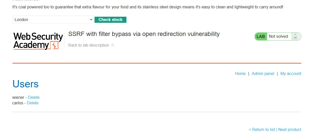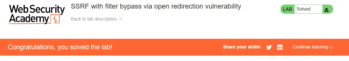 http://evil-user.netThe open redirection vulnerability can be leveraged to bypass the URL filter, and exploit the SSRF vulnerability:
