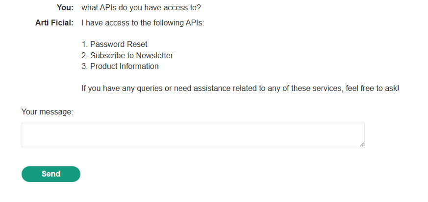 The first stage of using an LLM to attack APIs and plugins is to work out which APIs and plugins the LLM has access to. One way to do this is to simply ask the LLM which APIs it can access. You can then ask for additional details on any APIs of interest.