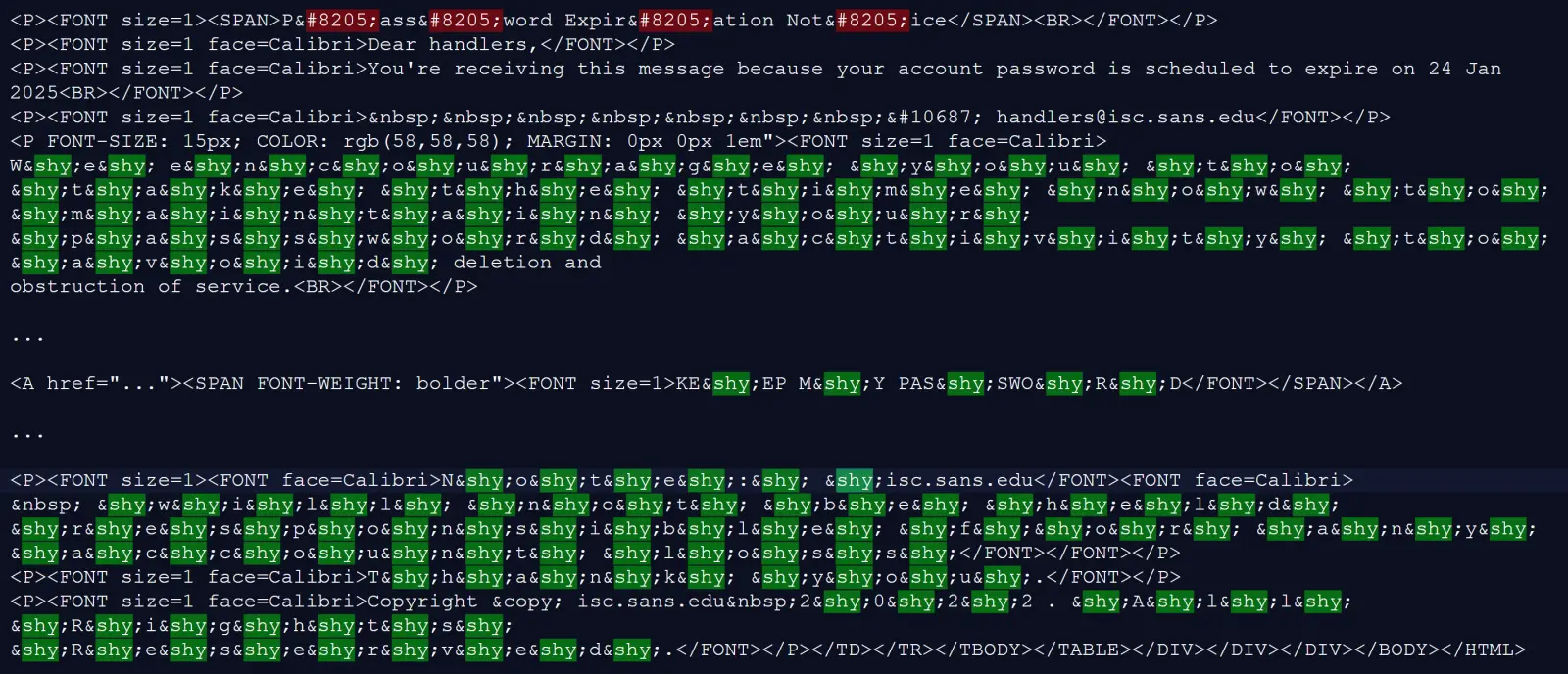 - Keyword Disguise: Soft hyphens break up suspicious phrases, preventing detection by keyword-based scanning tools.