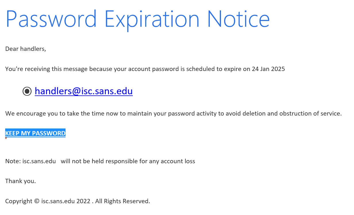 - Phishing email mimicking password expiration notice.