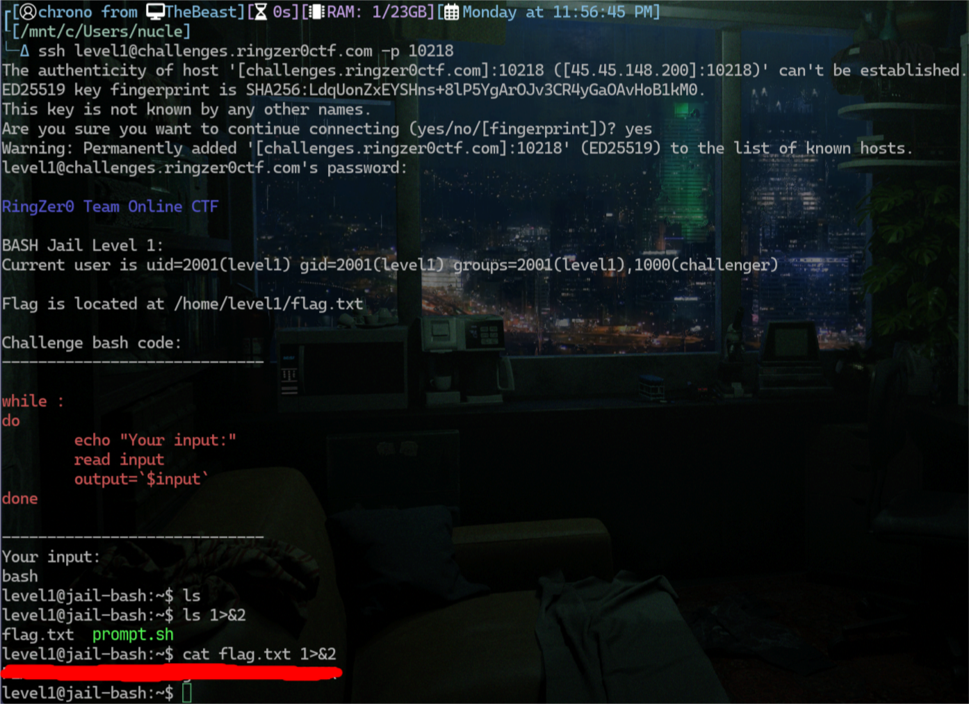 We connect to the host, and we enter the username and password. We are given the challenge’s bash code, and are asked for an input. If we enter in bash, it will spawn another shell! I used 1>&2 to ignore the jail’s restrictions, and print the output directly to the screen. If we browse the machine on the new bash terminal, we can find the flag.txt and cat it to our screen, once again using the 1>&2 redirect operator.