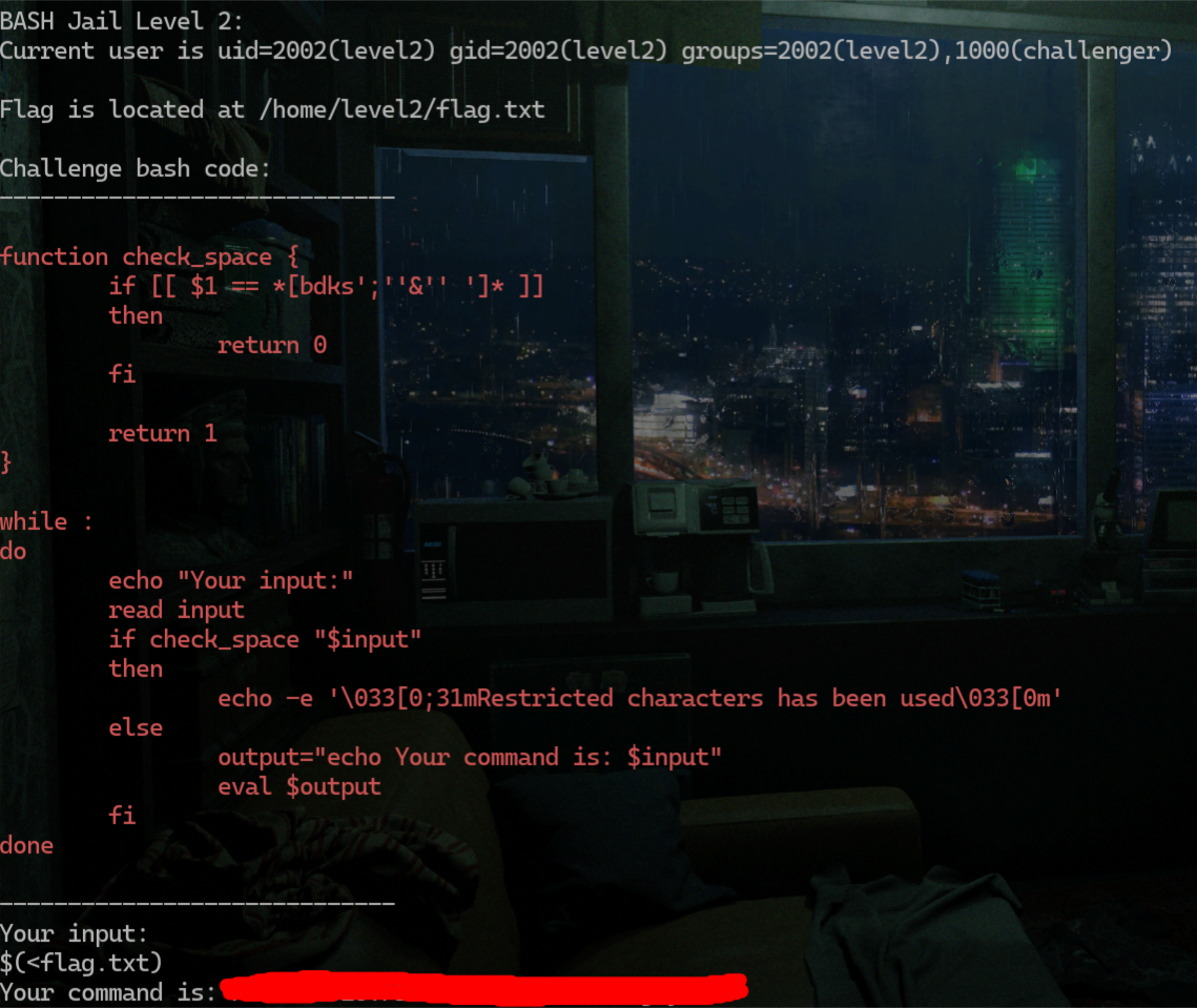 I simply read the content of flag.txt by using command substitution to bypass the restrictions put on the challenge. I basically used eval location_of_flag but instantly redirected the output to console. < was not one of the restricted characters. 😁