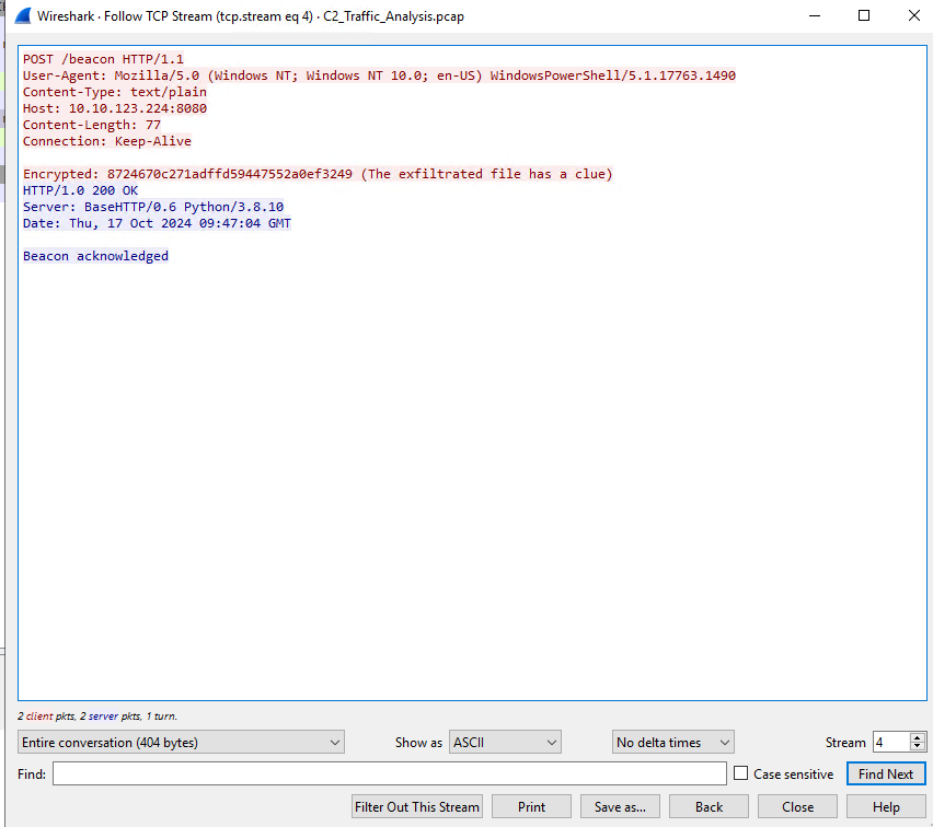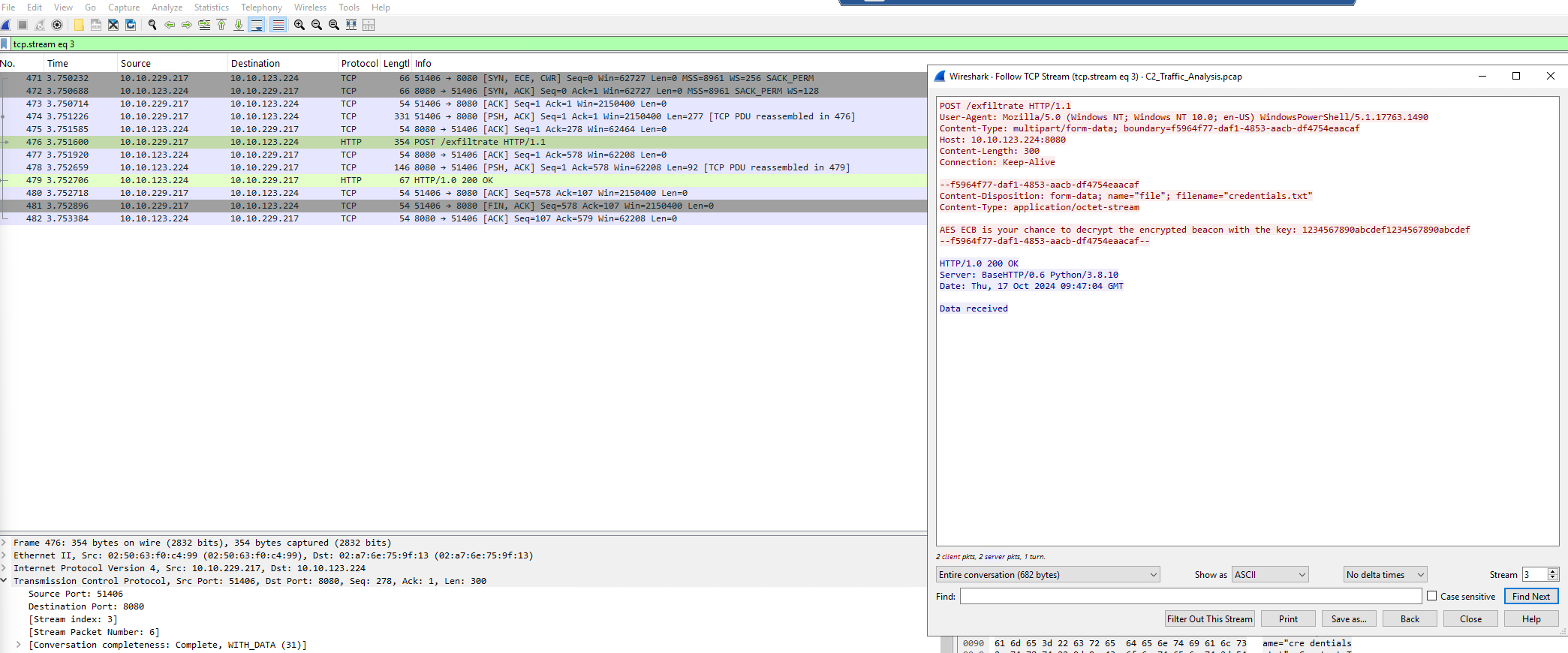 If we follow the HTTP Stream for the POST /exfiltrate packet (Frame 476) sent to the same destination IP, we will see a file exfiltrated to the C2 server.