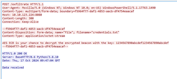 Encrypted: 8724670c271adffd59447552a0ef3249 (The exfiltrated file has a clue)