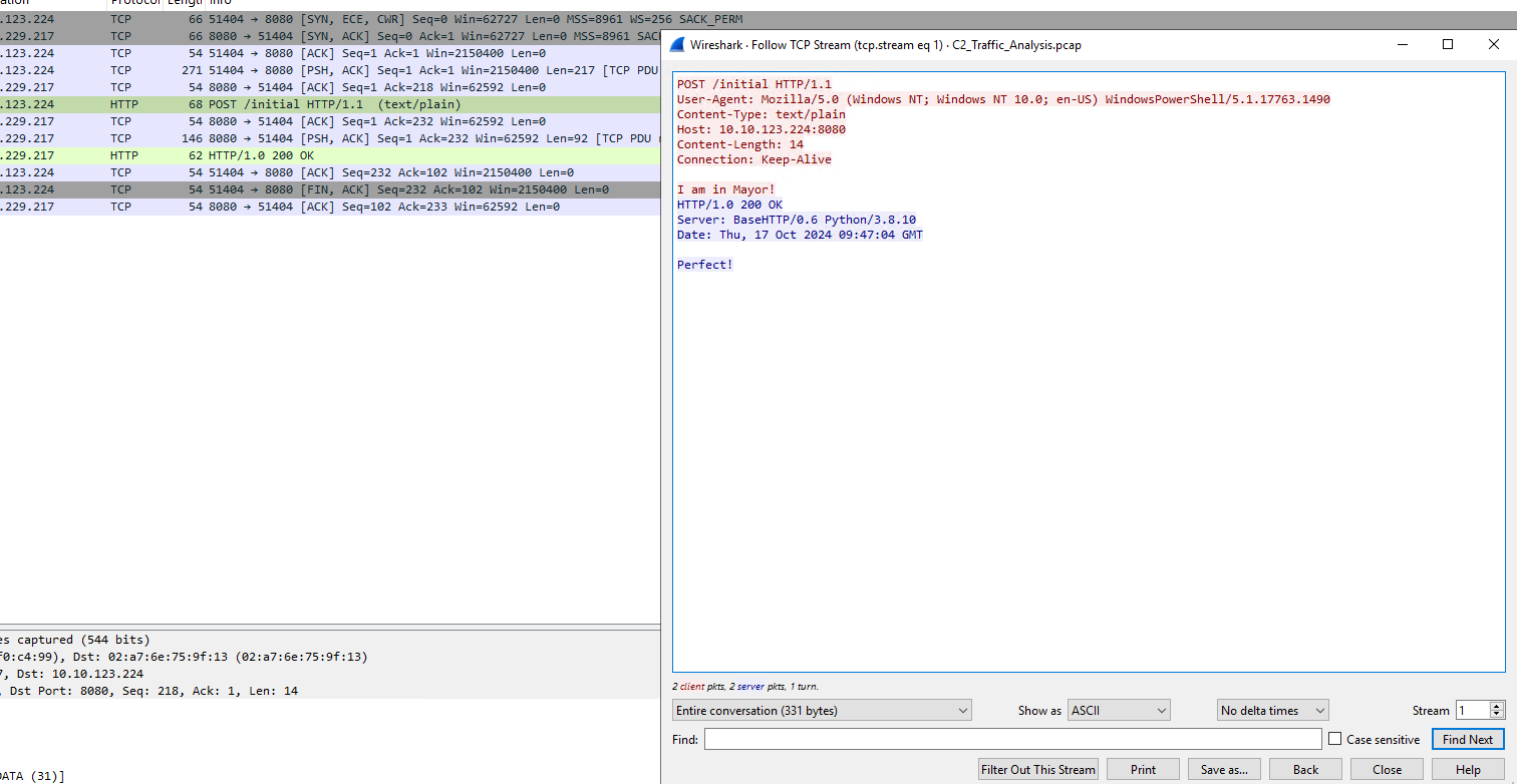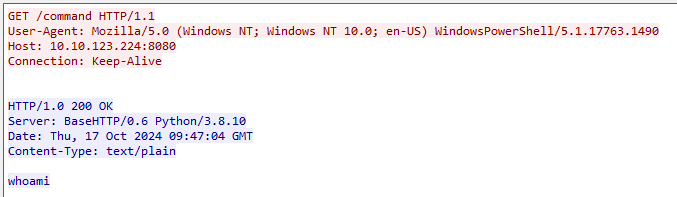If we follow the HTTP Stream for the GET /command packet (Frame 457), we can see that the message was sent out and acknowledges that the payload is inside the victim.