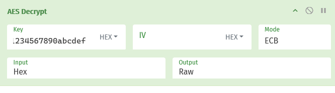 Make sure you use the key from the previous step, and select ECB mode on the AES Decrypt Function.