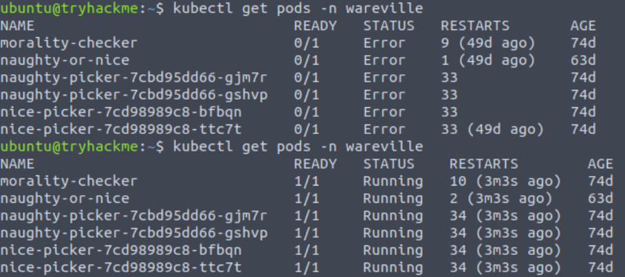 To check that cluster is up and running, use kubectl get pods -n wareville. It might take a few tries: