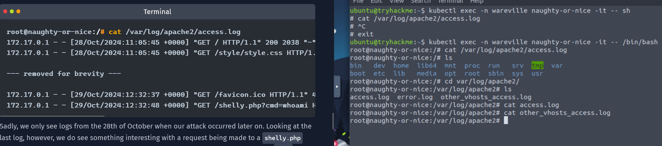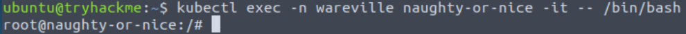 We can connect to a specific pod using the command kubectl exec -n wareville naughty-or-nice -it -- /bin/bash.