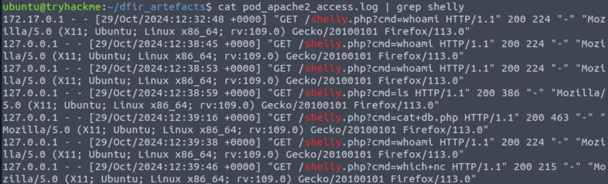 With these results, and the massive log, we can search for connections from that specific ip using grep. Once executed, we get: