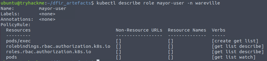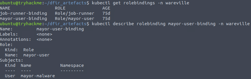 These two commands show the rolebindings for users and finds a specific one tied to Mayor Malware: