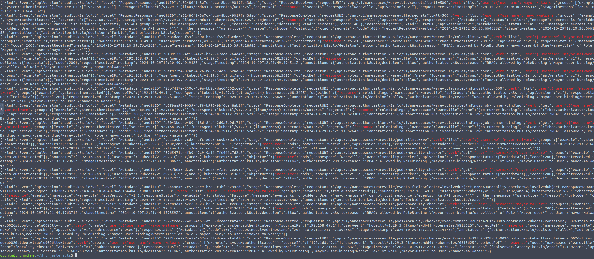 cat audit.log | grep --color=always '"user":{"username":"system:serviceaccount:wareville:job-runner-sa"' | grep --color=always '"resource"' | grep --color=always '"verb"'If we run this final command, we can confirm the attack path!