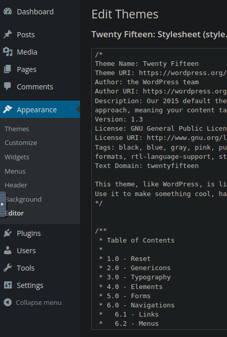 If we browse to the Appearance side panel, and down to Editor, we can see it is available for us to use. This is a popular attack vector as the css can be customized on the site via a dialog.
