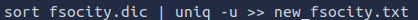 We can cut out all duplicates and leave the unique words by sorting the file and executing the uniq command as such:
