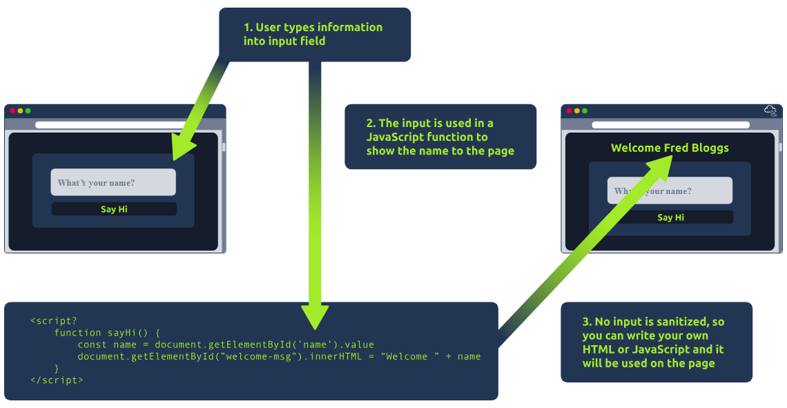 Input sanitisation is very important in keeping a website secure, as information a user inputs into a website is often used in other frontend and backend functionality. A vulnerability you’ll explore in another lab is database injection, where you can manipulate a database lookup query to log in as another user by controlling the input that’s directly used in the query - but for now, let’s focus on HTML injection (which is client-side).