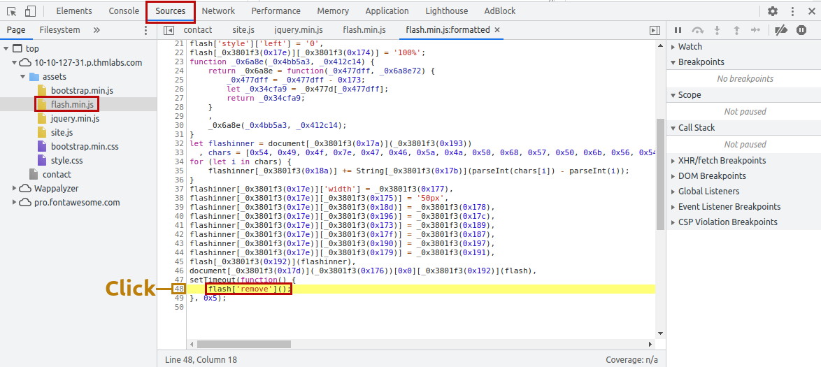 In the debugger, you can peruse to the Sources tab to try and find any vulnerable lines of code within the website. For example, in in the flash.min.js file in assets while browsing the customer subdomain, you can attach a breakpoint to a line and refresh the page, revealing a hidden flag: