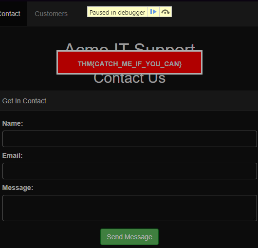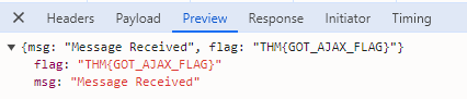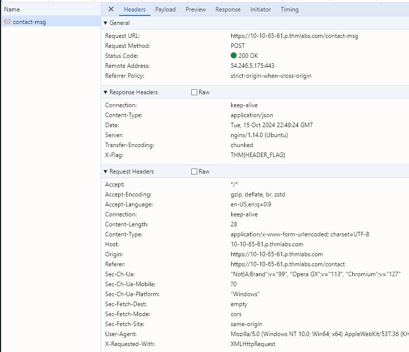 Here, there is a red herring, we can see a flag, THM{HEADER_FLAG}, but it is not the one we want! If we go a few tabs down within the contact-msg event, down to Preivew or Response, you will find the correct flag: