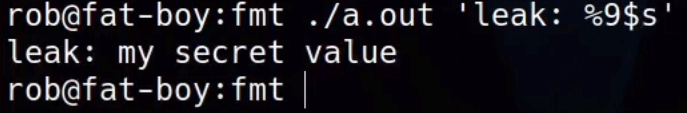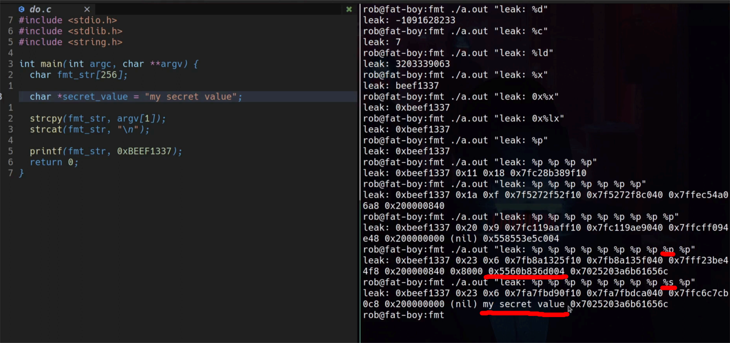 %x: leaks 4 bytes.%hx: leaks 2 bytes.%hhx: leaks 1 byte.%lx: leaks 8 bytes.%7$x: prints the 7th parameter (on the stack).- The